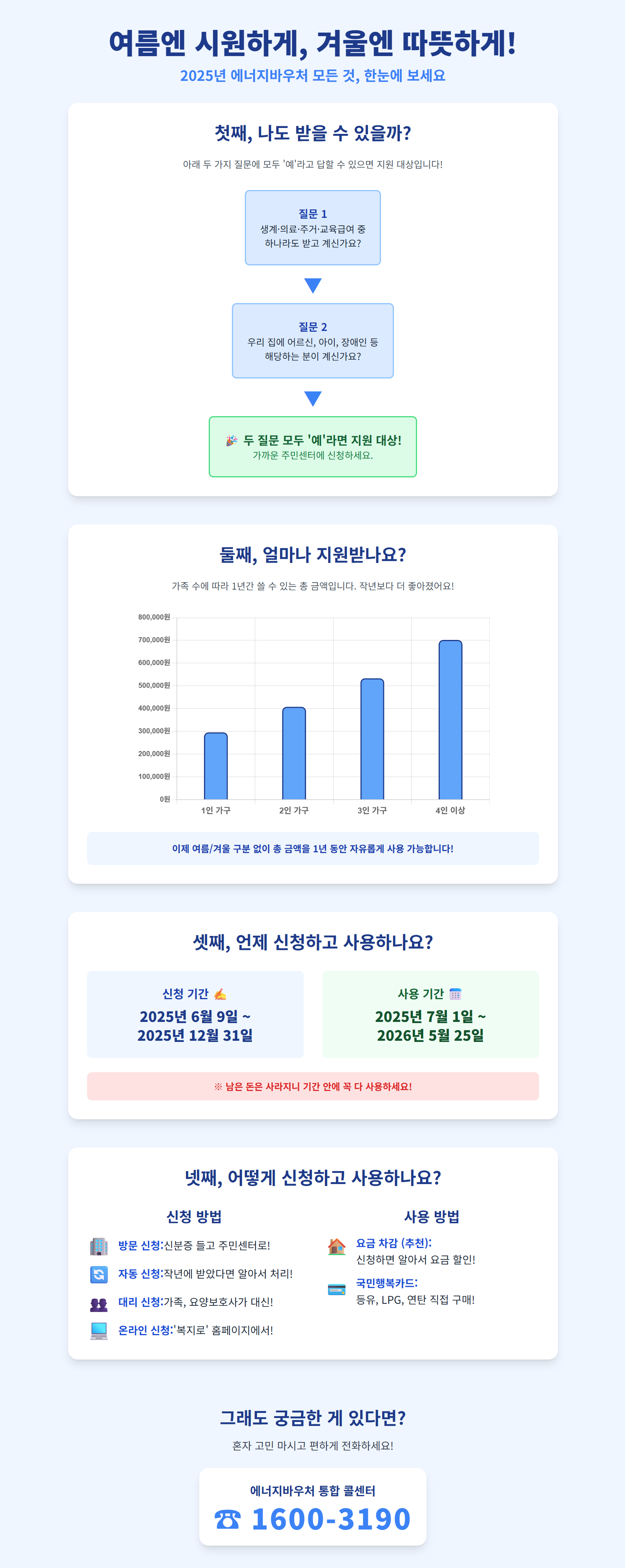 2025년부터는 아주 좋은 소식이 있어요. 예전처럼 여름에 얼마, 겨울에 얼마 나눠 쓸 필요 없이, 이 총금액을 1년 동안 필요할 때마다 자유롭게 꺼내 쓸 수 있게 됐답니다. 여름에 좀 더 덥다 싶으면 냉방비로 더 많이 쓰고, 겨울에 유독 춥다 싶으면 난방비로 더 많이 쓸 수 있으니 정말 편리해졌죠?